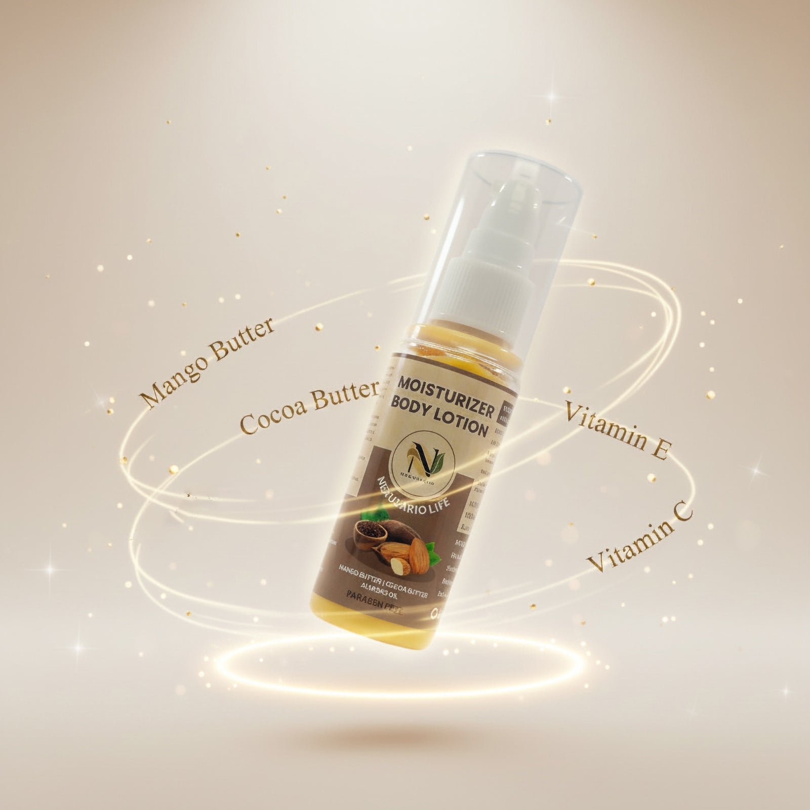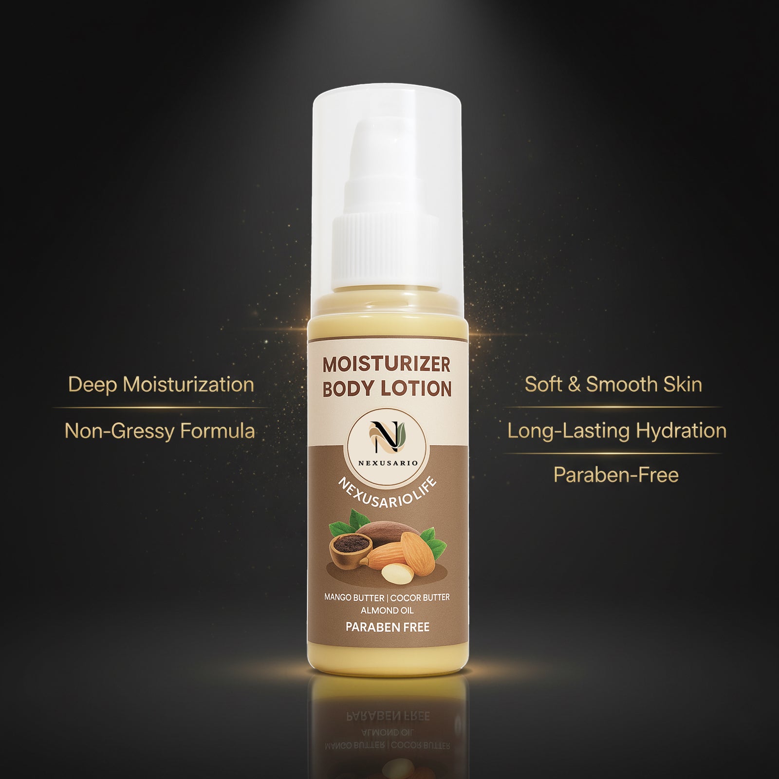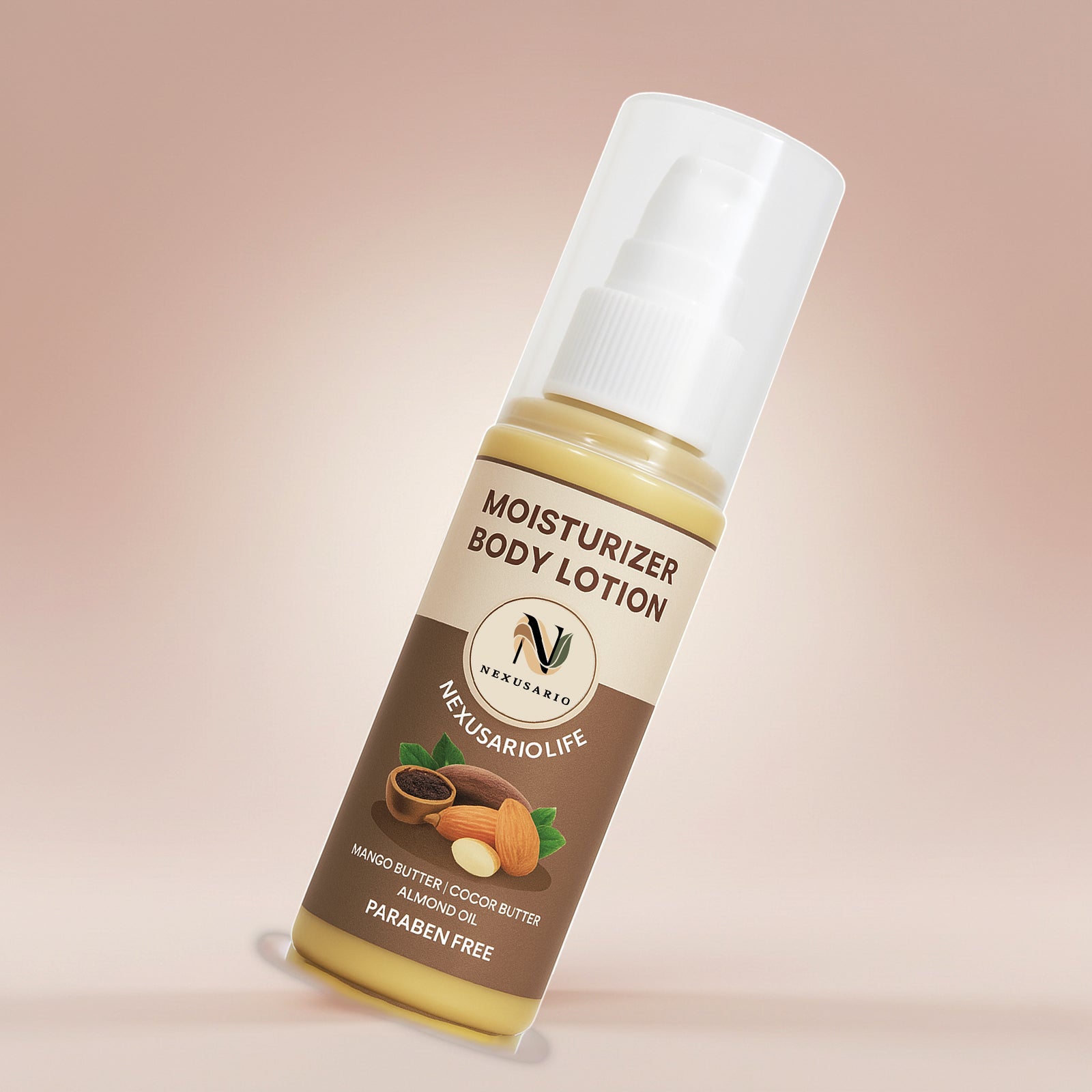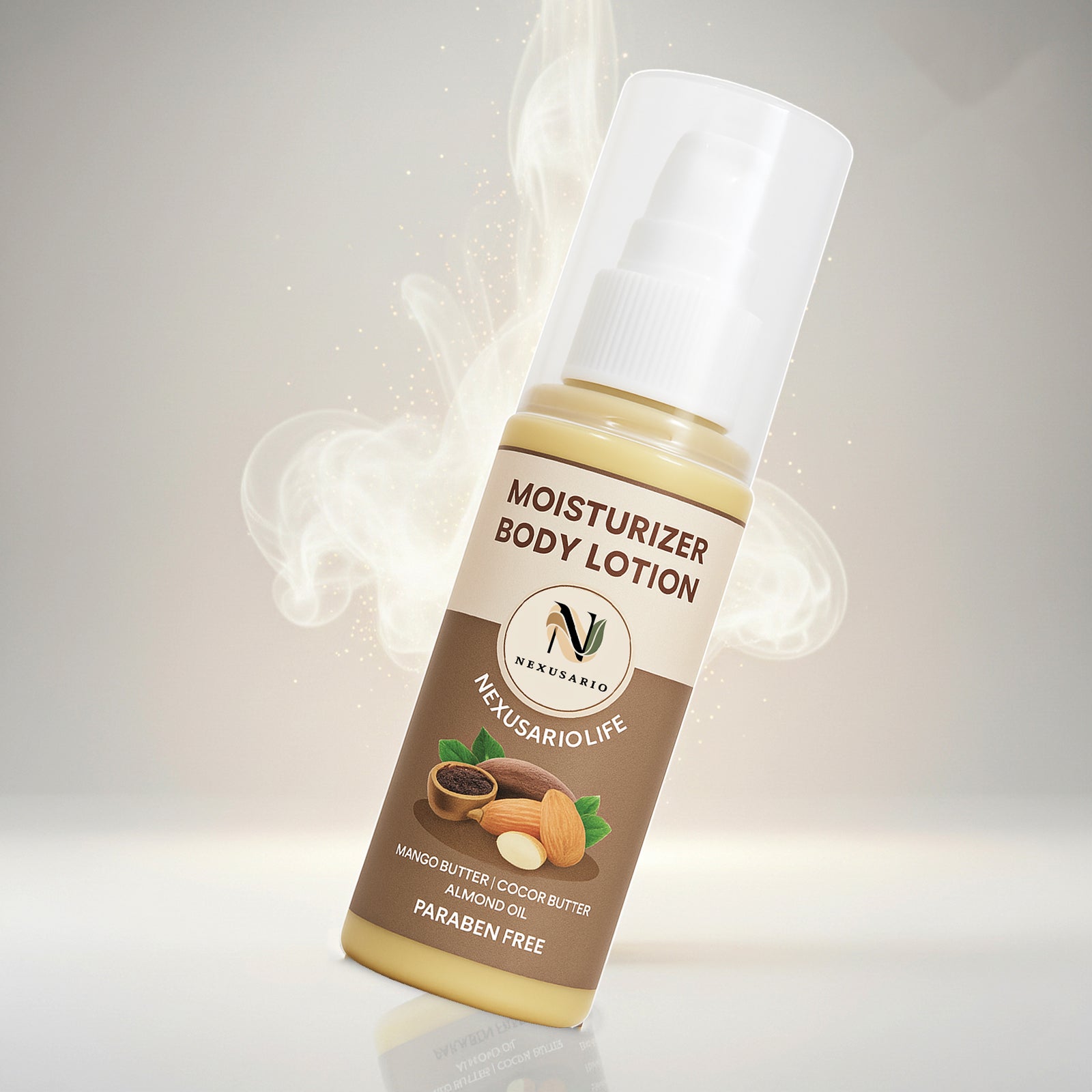 Banish Dryness. Restore Your Glow. Treat your skin to the luxurious hydration of Nexusario’s body lotion. Enriched with a potent blend of Mango, Cocoa, and Shea butters, this formula penetrates deep to heal dryness, inflammation, and itching instantly.